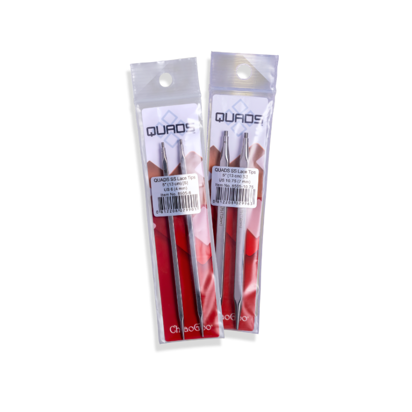 ChiaoGoo QUADS är fyrkantiga, utbytbara ändstickor i rostfritt stål, utvecklade för dig som vill sticka mer avslappnat utan att kompromissa med precision eller känsla.